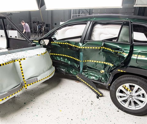 Action shot taken during the passenger-side small overlap frontal crash test.