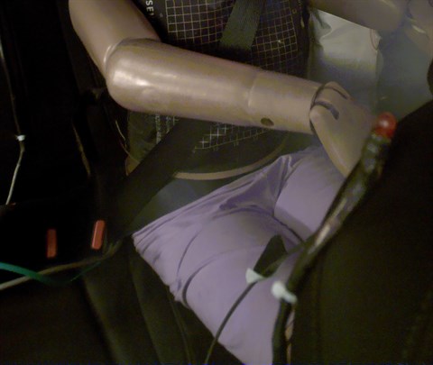 The dummy's position in relation to the door frame, steering wheel, and instrument panel after the crash test indicates that the driver's survival space was maintained very well.
